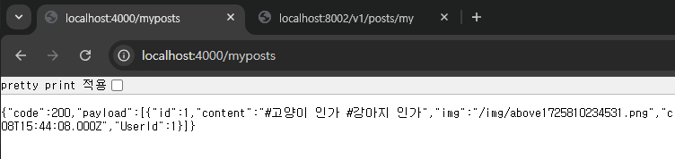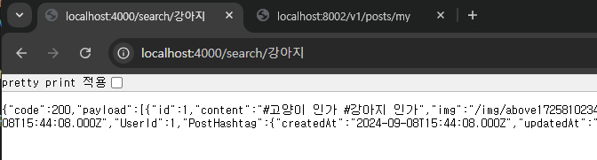 자기가 작성한 게시글 과 해시태그 검색하는 코드를 작성한 후 결과는 아래와 같습니다.