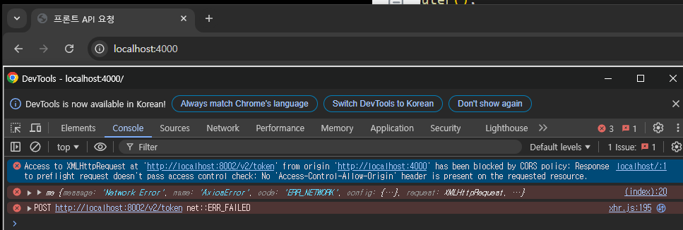 웹브라우저에서 api를 호출할 때는 아래와 같이 cors 에러가 발생한다. 기존에는 서버에서 직접 api를 호출 했기 때문에 cors 에러가 발생하지 않았다.
