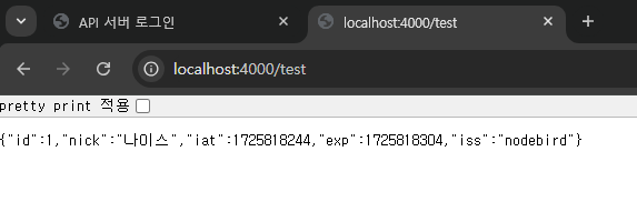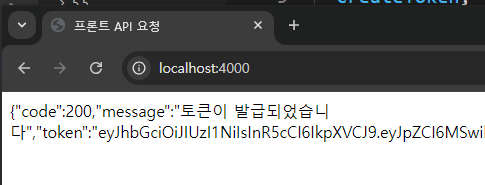 lecture-api 라는 api를 제공하는 서버의 코드를 작성한다. 작성한 후에 localhost:4000/test 로 접속을 하면 lecture-api 서버에서는 아래와 같이 200 코드가 출력되고 토큰을 클라이언트로 넘겨준다.