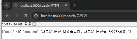 - v1 버전을 사용했을 때 : call 하는 클라이언트 서버의 request 함수에서 throw error 로 처리하면 아래와 같이 에러코드만 나오고 안내 메세지가 안 나온다.