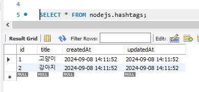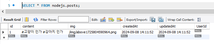 Executing (default): SELECT TABLE_NAME FROM INFORMATION_SCHEMA.TABLES WHERE TABLE_TYPE = 'BASE TABLE' AND TABLE_NAME = 'PostHashtag' AND TABLE_SCHEMA = 'nodejs'
