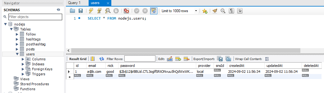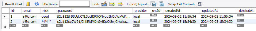 Executing (default): SELECT `id`, `email`, `nick`, `password`, `provider`, `snsId`, `createdAt`, `updatedAt`, `deletedAt` FROM `users` AS `User` WHERE (`User`.`deletedAt` IS NULL AND `User`.`email` = 'a@b.com');