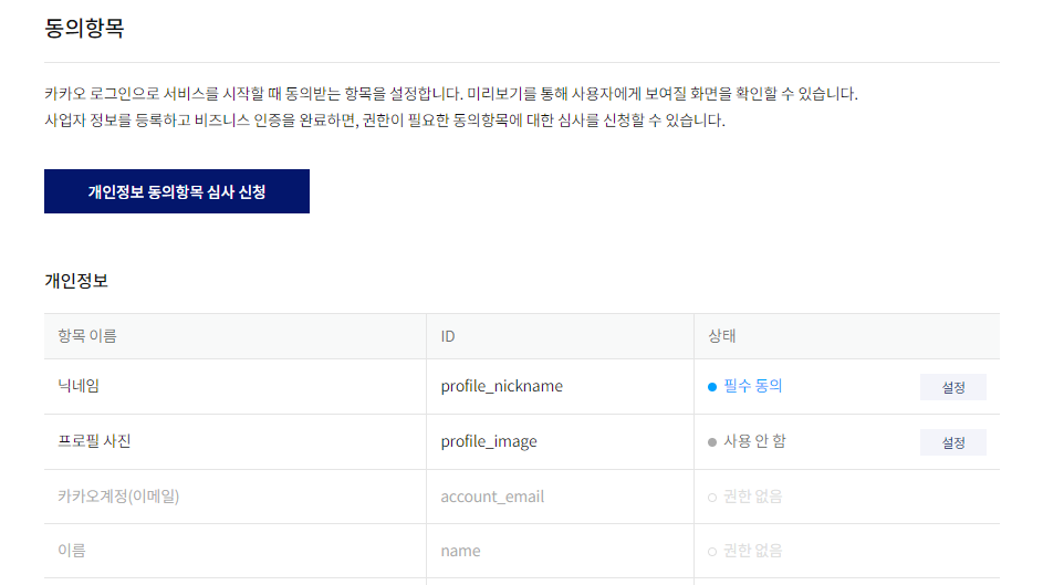 하지만 카카오톡 로그인이 강의 시점과 달라져서 아래와 같이 이메일은 권한이 없어서 못 받아오는 것으로 보인다. 비즈앱으로 등록을 해야만 권한이 허용되는 것 같다.