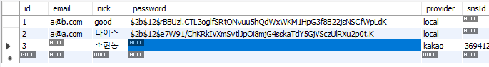 그래도 이름, snsID는 받아와서 로그인은 되었지만 아래와 같이 DB에는 이름만 받아오는 것을 확인할 수 있었다.