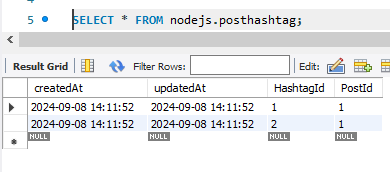 Executing (default): CREATE TABLE IF NOT EXISTS `PostHashtag` (`createdAt` DATETIME NOT NULL, `updatedAt` DATETIME NOT NULL, `HashtagId` INTEGER , `PostId` INTEGER , PRIMARY KEY (`HashtagId`, `PostId`), FOREIGN KEY (`HashtagId`) REFERENCES `hashtags` (`id`) ON DELETE CASCADE ON UPDATE CASCADE, FOREIGN KEY (`PostId`) REFERENCES `posts` (`id`) ON DELETE CASCADE ON UPDATE CASCADE) ENGINE=InnoDB DEFAULT CHARSET=utf8mb4 COLLATE utf8mb4_general_ci;