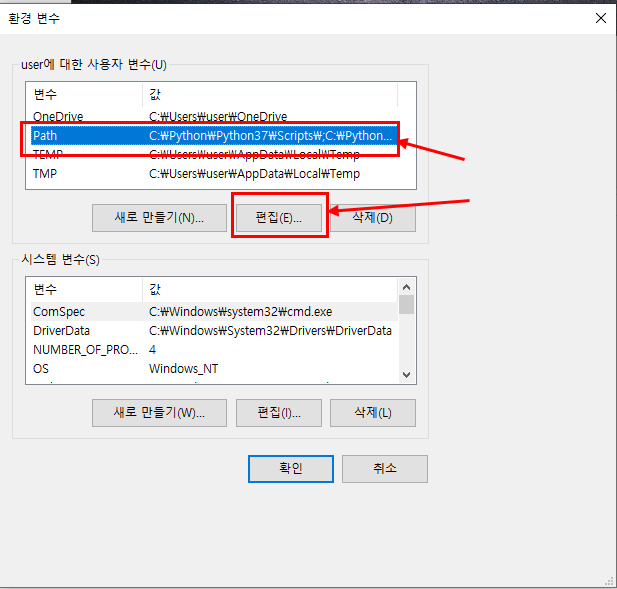 두번째는 재설치 하지 않고 환경변수 추가( add path )하는 방법은