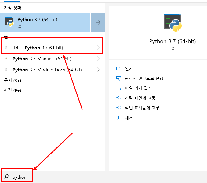 돋보기 버튼에서 바로 idle 을 입력하셔서 실행하셔도 됩니다.