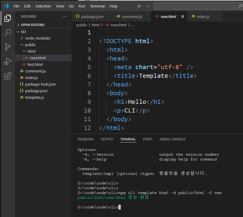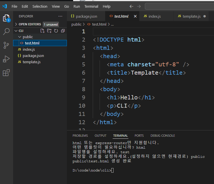 template를 자동으로 만들어 주는 cli 프로그램을 수행한 결과 화면