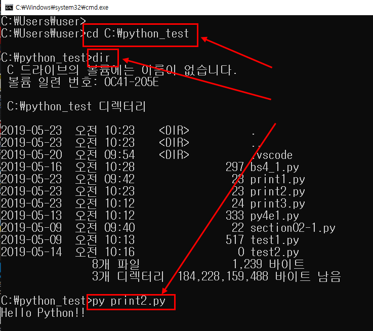 파이썬 파일을 저장한 경로로 이동한 후에 ( cd c:\python_test )